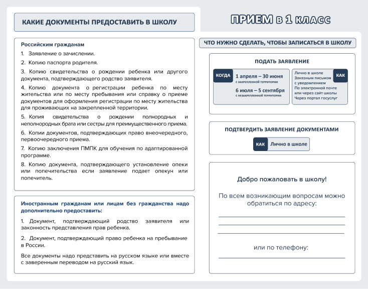 Приём документов на 2024-2025 учебный год в первый класс будет осуществляться с понедельника по пятницу, в приёмной школы с 9.00 до 16.00, перерыв на обед с 12.30 до 14.00, тел. 2-04-32.